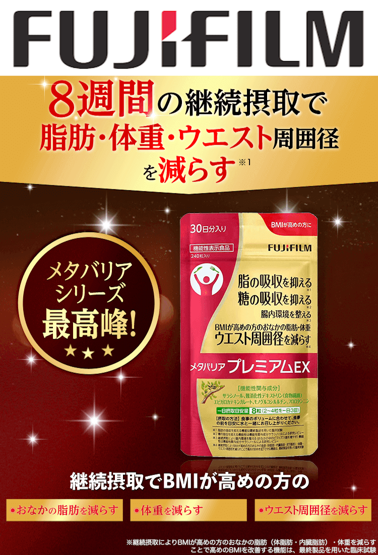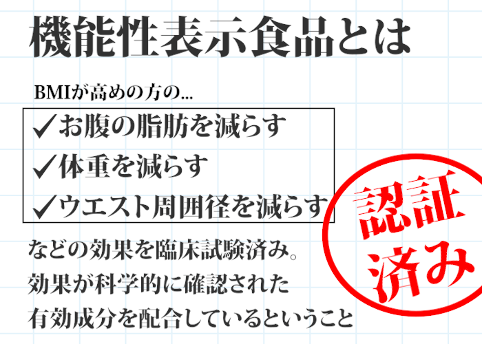 ※継続摂取によりBMIが高めの方のおなかの脂肪(体脂肪・内臓脂肪・皮下脂肪)・体重・ウエスト周囲径を減らすことで高めのBMIを低下させる機能は、最終製品を用いた臨床試験より。